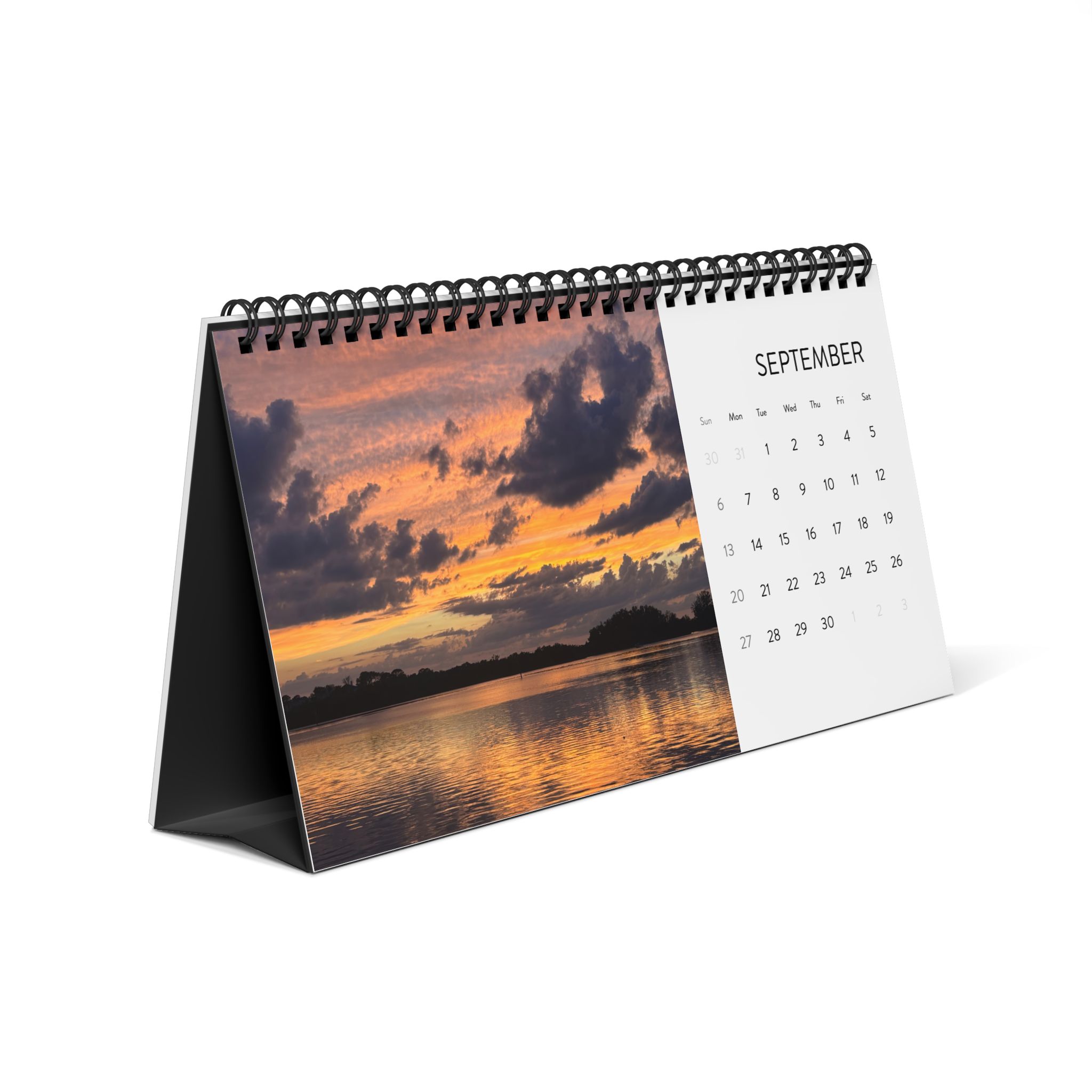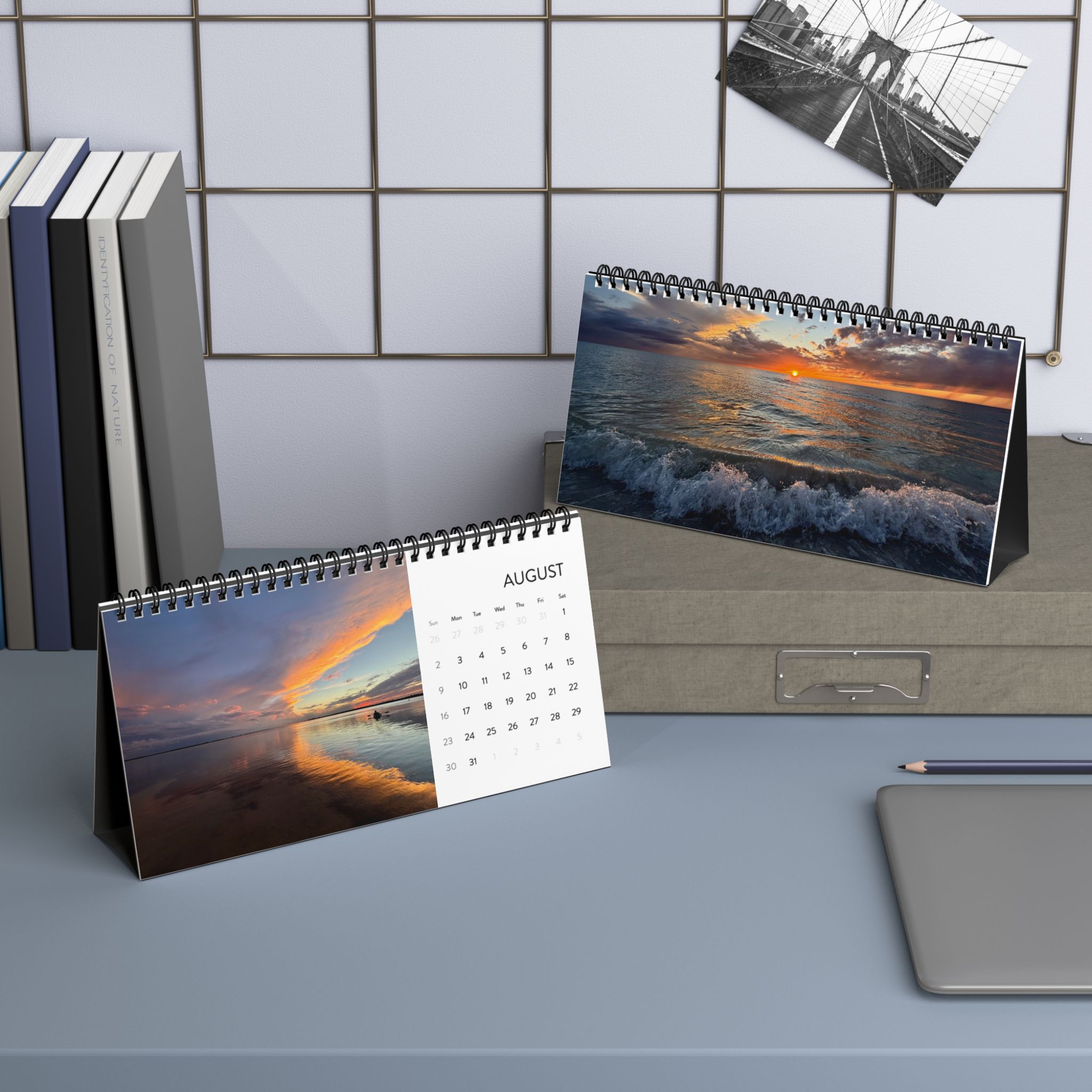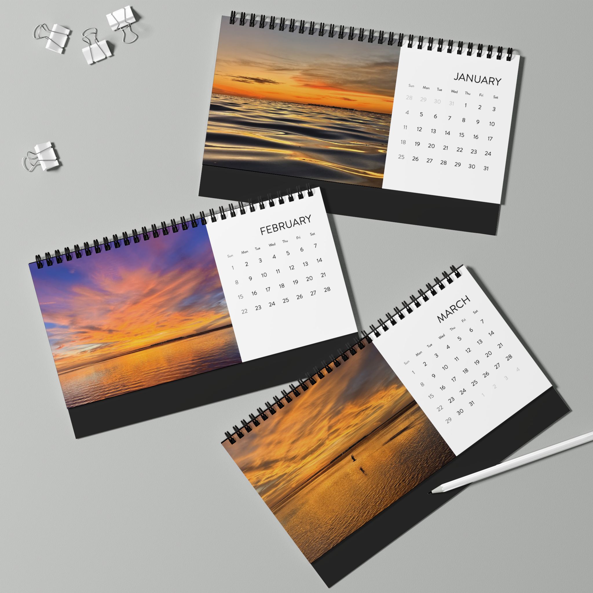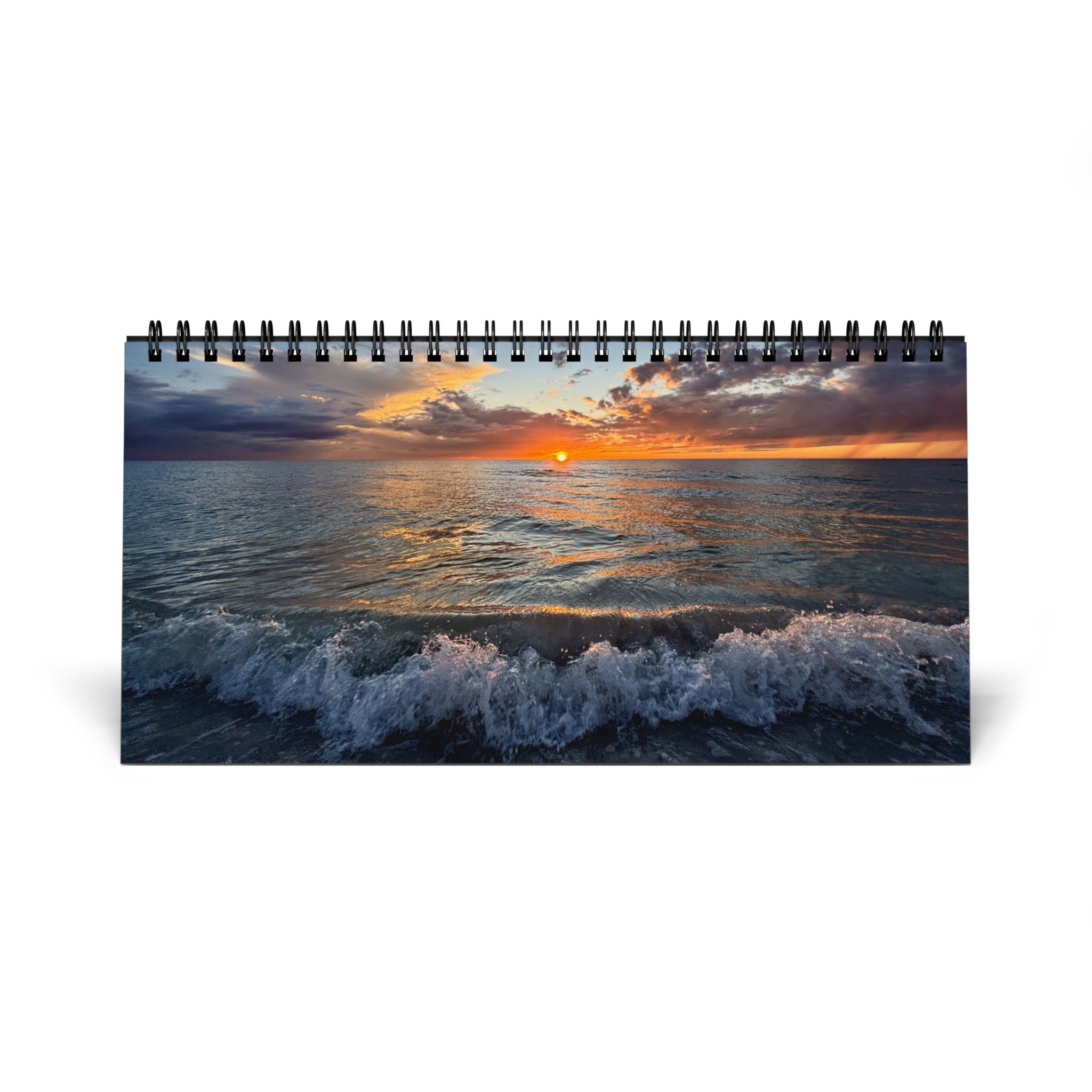 Morning light spills across the shoreline page after page. This 2026 desktop calendar captures ocean sunrises and sunsets in vivid, painterly color: moments that slow the breath and stretch the day. Set it on a writing desk, a kitchen counter, or a home studio shelf and let the horizon shift with each month. The compact 10" x 5" grid gives you space to jot plans and mark tides of time without crowding your workspace. The matte, heavyweight pages and black metal spiral hold each scene steady, so flipping to the next month feels deliberate, calm, and a little like stepping outside to watch the sky change.