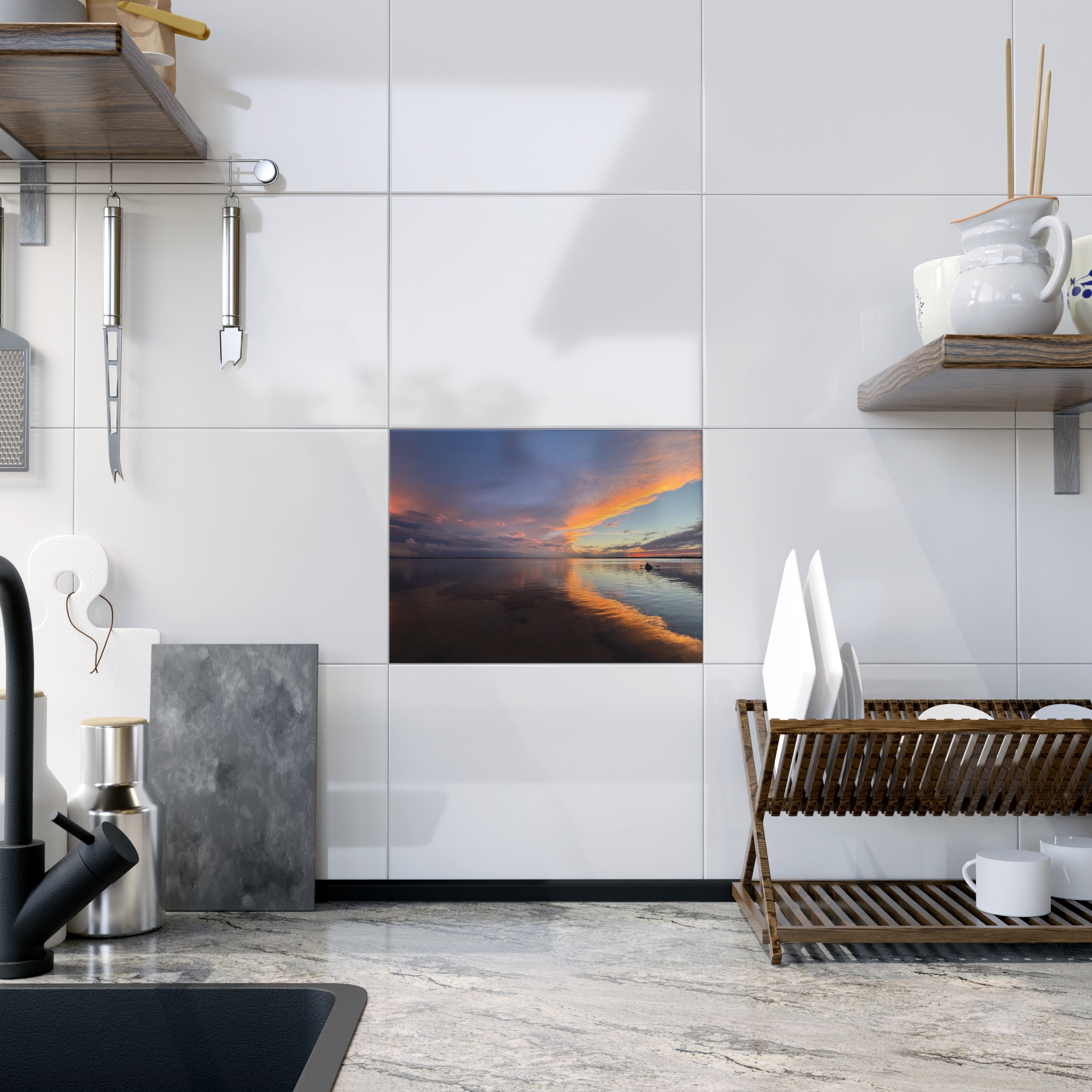 A small ceramic tile that holds a quiet moment - a lone kayaker slipping across glassy water beneath a painted sunset. The scene breathes pastel blues, peaches, and golds; elongated clouds curve across the sky and mirror themselves perfectly on the water’s surface. Hung on a kitchen wall, propped on a shelf, or placed in a bathroom niche, this tile draws the eye and slows the pace. It’s for anyone who chases calm: those who wake early for a paddle, who keep a window open for evening light, or who collect pieces that bring stillness into a busy home. The image invites pause, reflection, and a small, private escape every time you pass it.