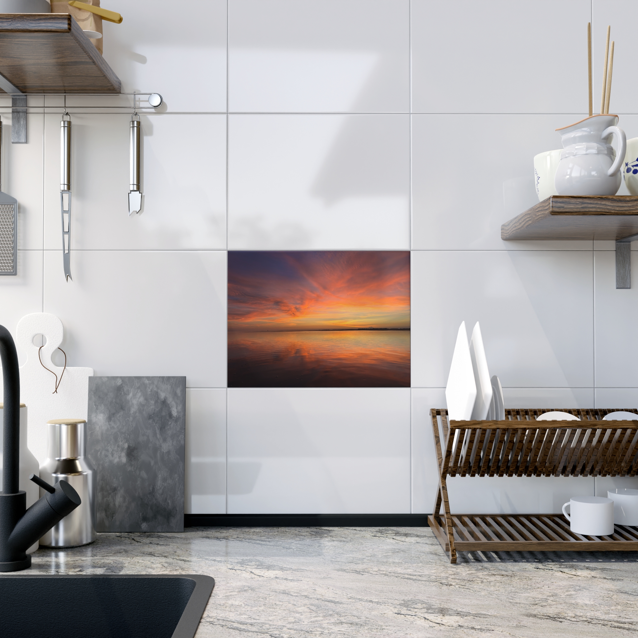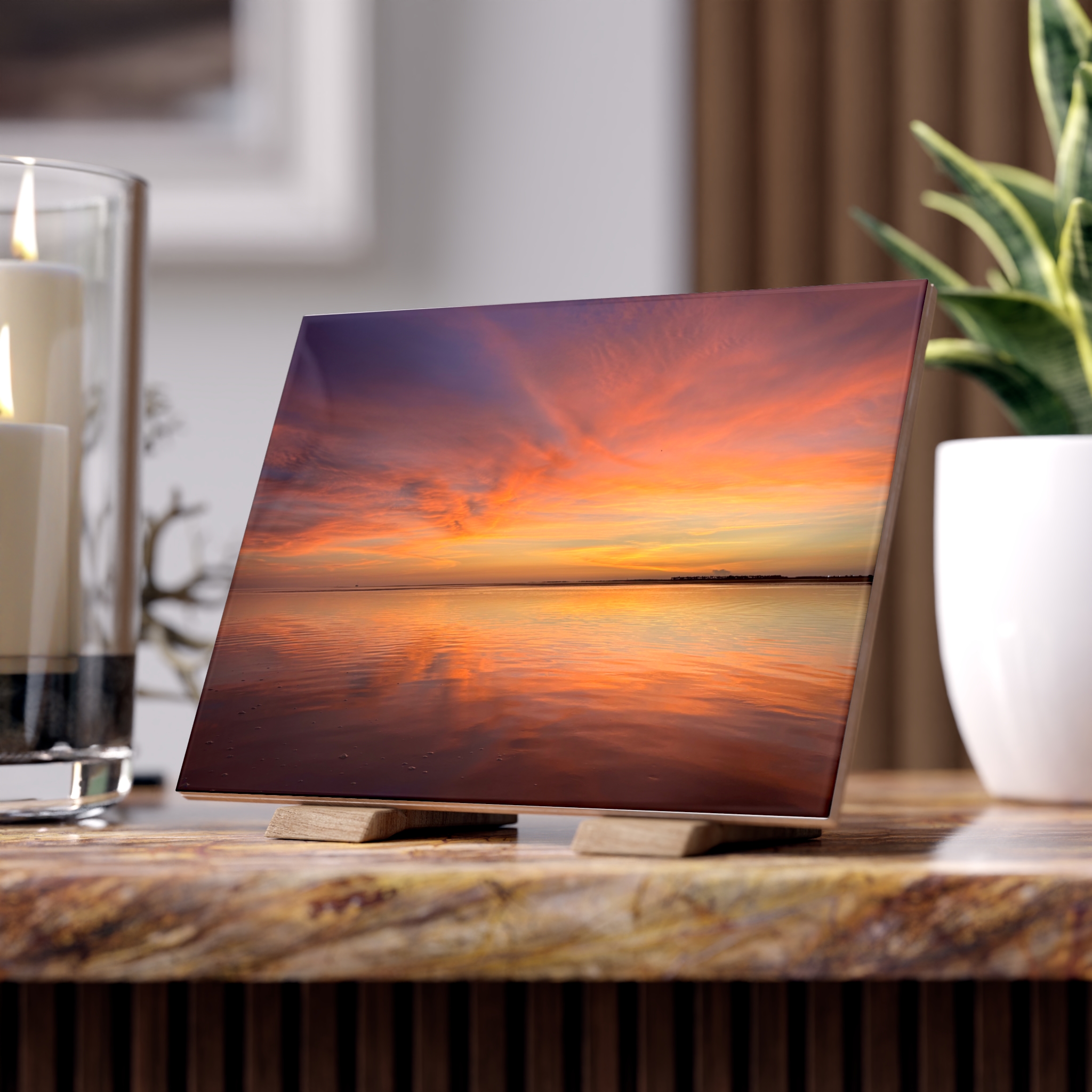 This ceramic photo tile captures the hush of a seaside sunset — a wide, tranquil shore under a sky washed in coral, peach, gold, and soft lavender. The feathered clouds fan outward like a slow breath, and the glasslike water mirrors the sky in long, fluid streaks. Place it on a counter, shelf, or gallery wall and let it pull a busy room into a quiet moment. It reads like a pause: contemplative, expansive, and quietly luminous. For someone who collects scenes of light and solitude, this tile becomes a small window to an evening that lingers.