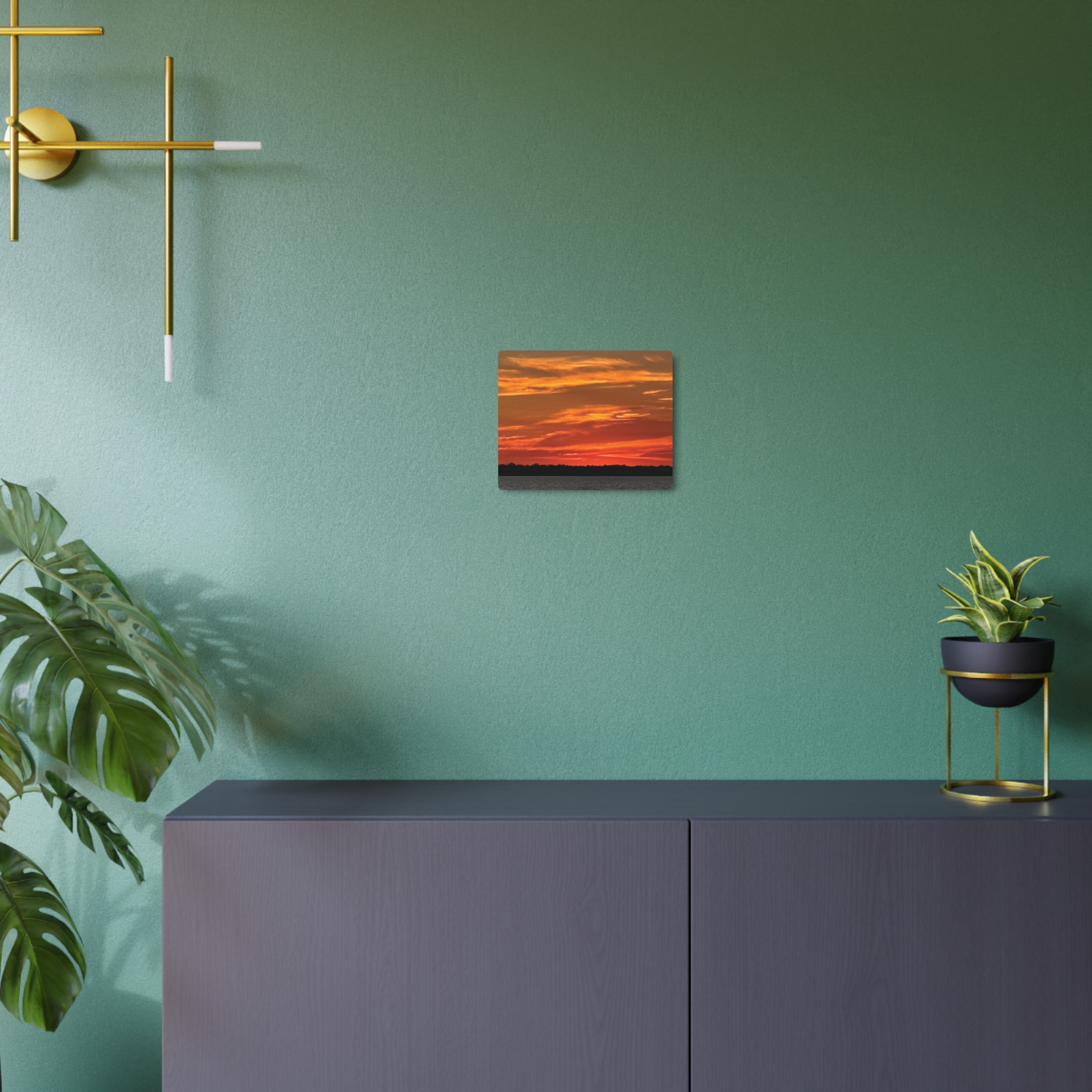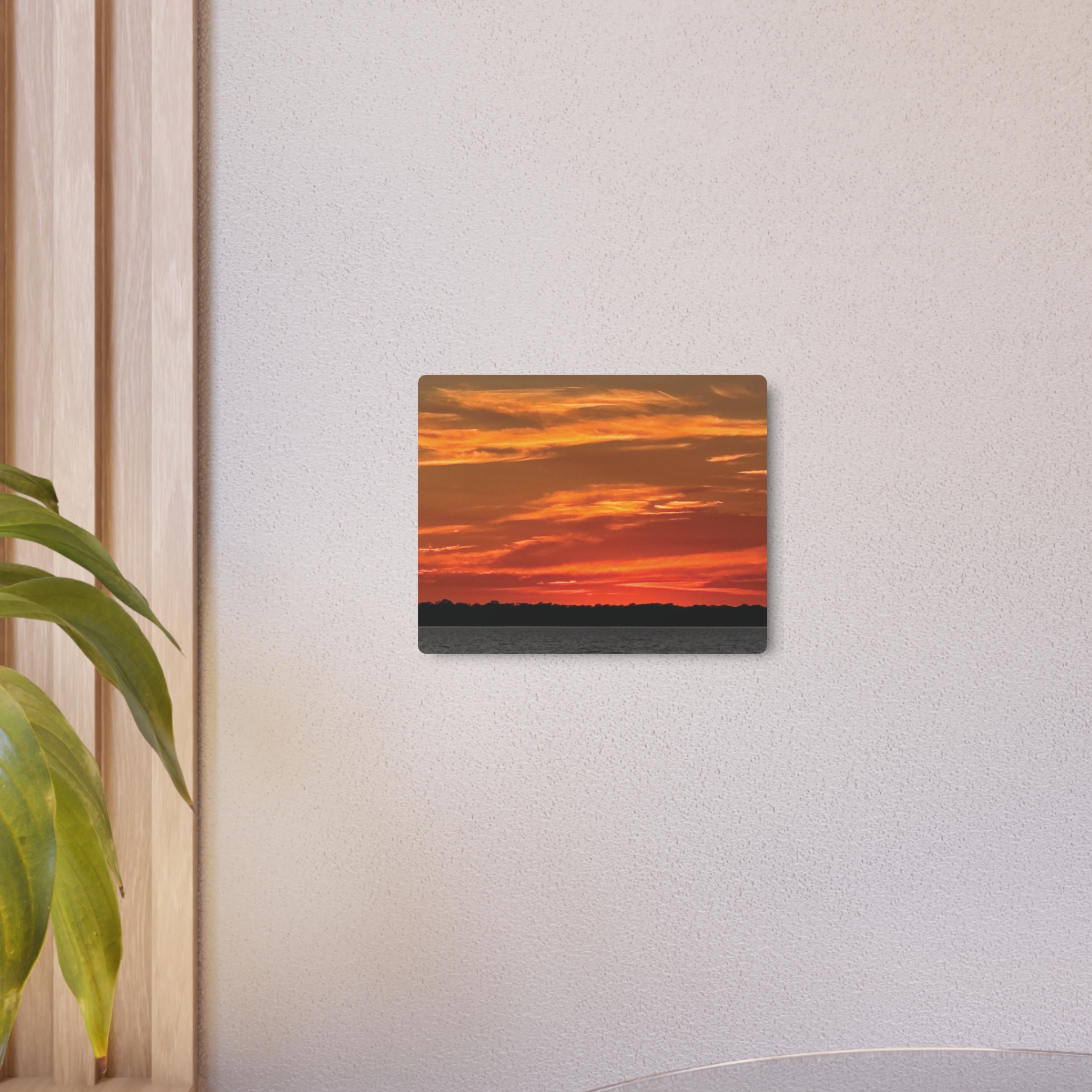 This metal art sign captures the hush of a sunset that burns quietly at the edge of the world. Bands of molten orange, amber, and deep crimson stretch across the sky above a stark, nearly black treeline, while the slate-toned water below holds only faint echoes of that glow. The composition’s horizontal layers: water, land, then fire lit sky - feel elemental and calm, like standing still as the day closes in a small, private moment. Hung on a wall, the piece brings a contemplative, wood smoke silhouette mood to living rooms, cabins, or entryways, inviting slow breaths and late-evening conversation.