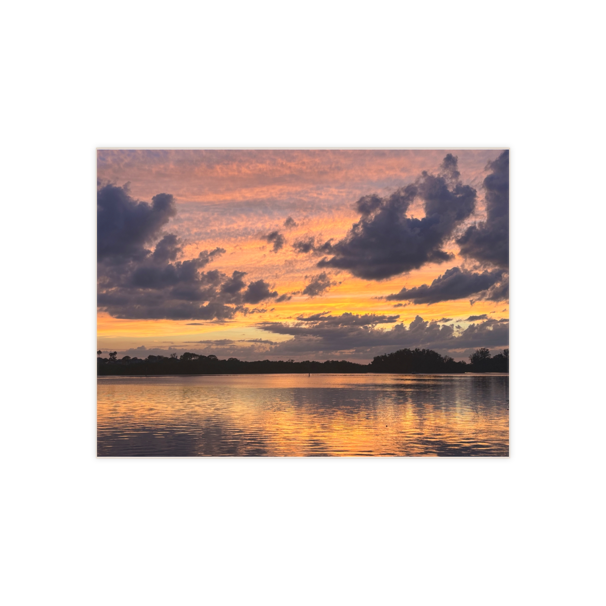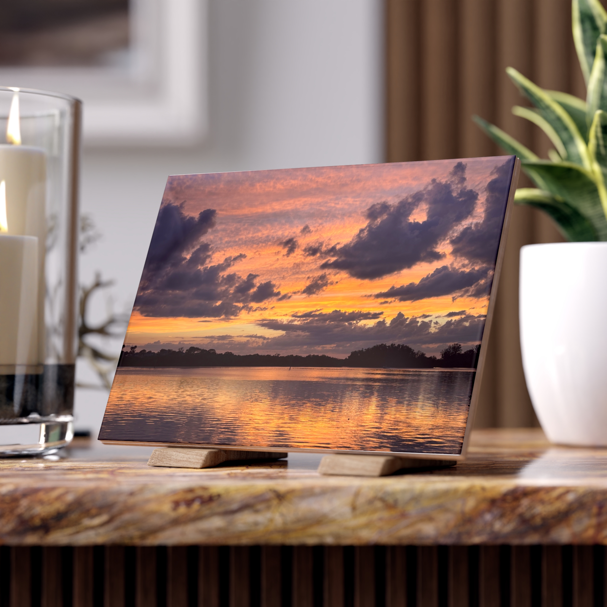 A ceramic photo tile that brings a quiet, twilight moment into your home. The scene — a wide estuary catching the last gold and lavender of sunset — feels like a private breath between day and night. Dark silhouettes of shoreline trees anchor the image while the sky and its mirrored ripples take center stage, making the tile a contemplative accent that settles into kitchens, bathrooms, or cozy nooks. Choose glossy for a luminous sheen that enhances the sunset’s glow, or matte for a softer, painterly presence. Personalize it with your favorite placement or caption to make this small canvas uniquely yours.